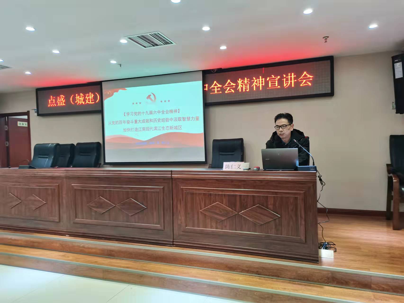 陳仁義以從黨的百年奮斗重大成就和歷史經(jīng)驗中汲取智慧力量,加快打造江南現(xiàn)代濱江生態(tài)新城區(qū)”為題,從我們黨為什么要做關(guān)于黨的百年奮斗歷程的決議、中國共產(chǎn)黨百年奮斗歷程的四個時期、中國共產(chǎn)黨百年奮斗的歷史經(jīng)驗總結(jié)和我們應(yīng)該怎么做四個方面作詳細闡述。號召全體干職工要以十九屆六中精神為指引,解放思想、干在實處、爭當表率,切實履行國有企業(yè)的政治責任、社會責任和經(jīng)濟責任。