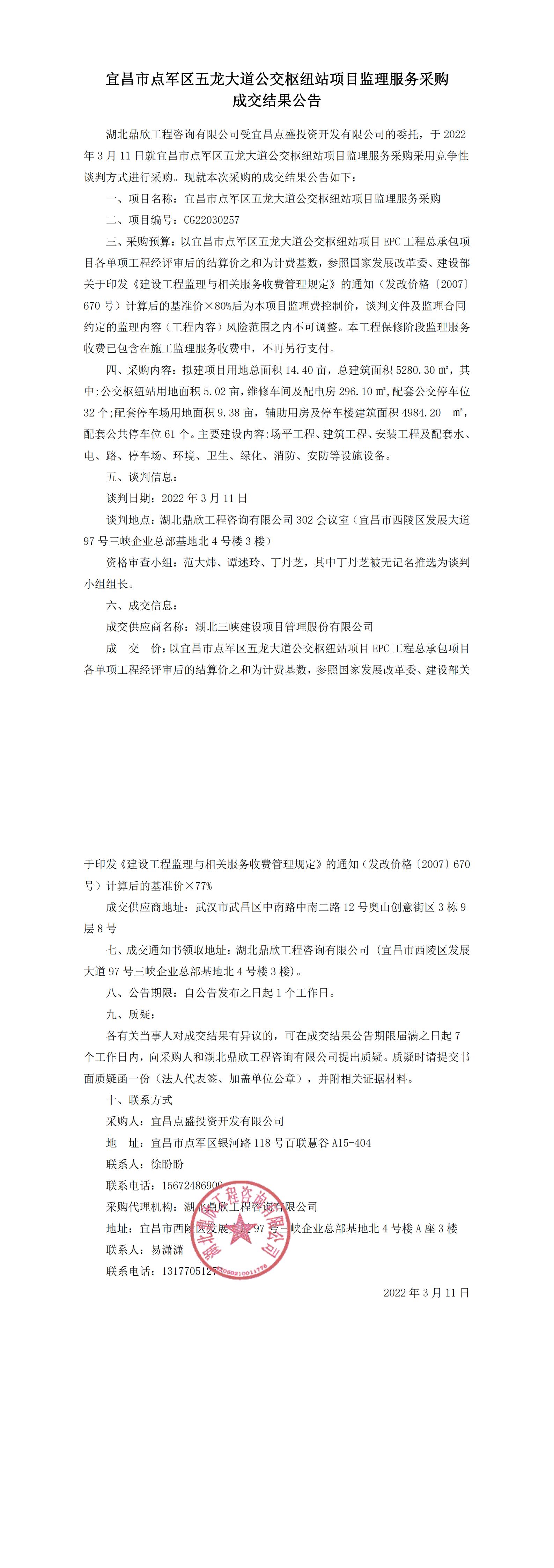 宜昌市點(diǎn)軍區(qū)五龍大道公交樞紐站項(xiàng)目監(jiān)理服務(wù)采購成交結(jié)果公告