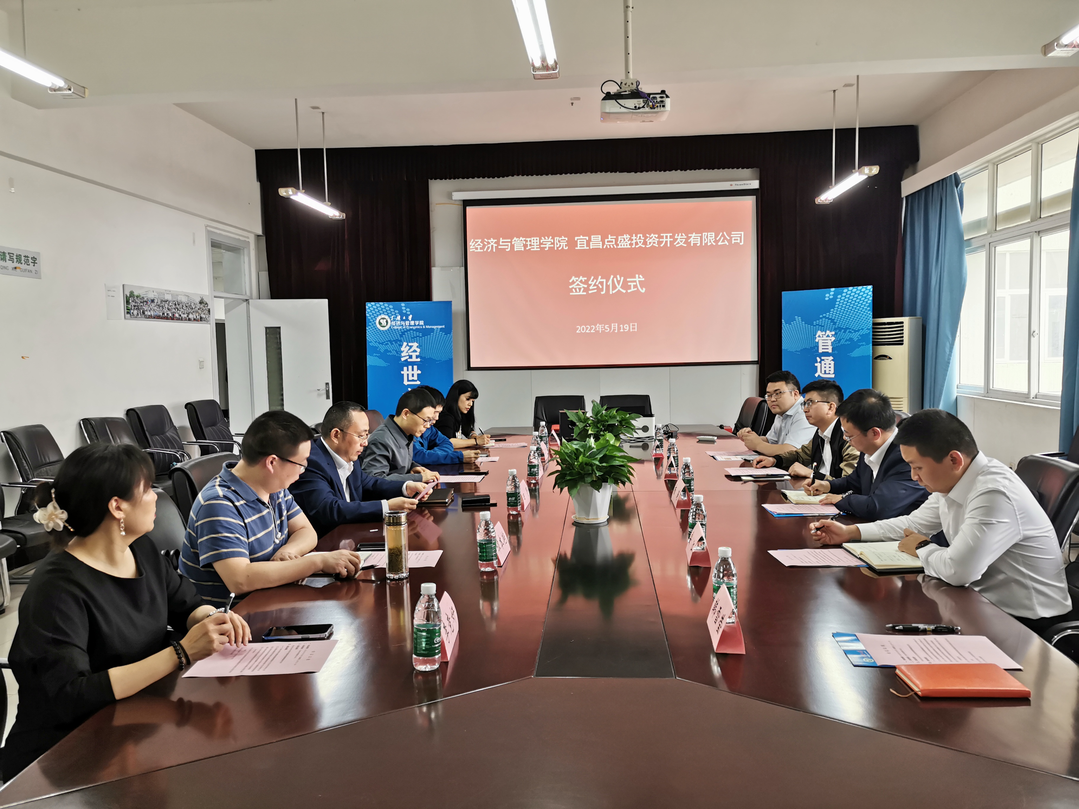 楊濤、覃朝暉代表雙方簽訂了《宜昌點(diǎn)盛投資開(kāi)發(fā)有限公司與三峽大學(xué)經(jīng)濟(jì)與管理學(xué)院戰(zhàn)略合作意向書(shū)》。