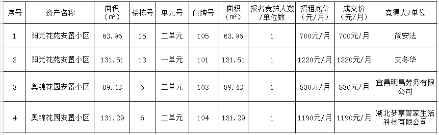 根據(jù)《點軍區(qū)出資企業(yè)資產(chǎn)租賃管理暫行辦法》及《宜昌點盛投資開發(fā)有限公司國有資產(chǎn)經(jīng)營使用實施辦法修訂版(2022.3)》,現(xiàn)對奧錦花園、陽光花苑安置小區(qū)住宅三年租賃權(quán)公開招租結(jié)果公告如下: