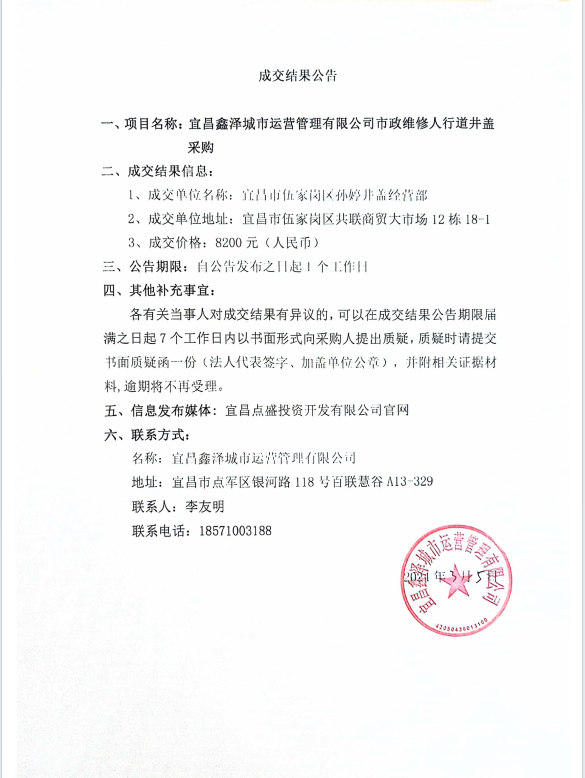 宜昌鑫澤城市運營管理有限公司市政維修人行道井蓋采購項目成交公告