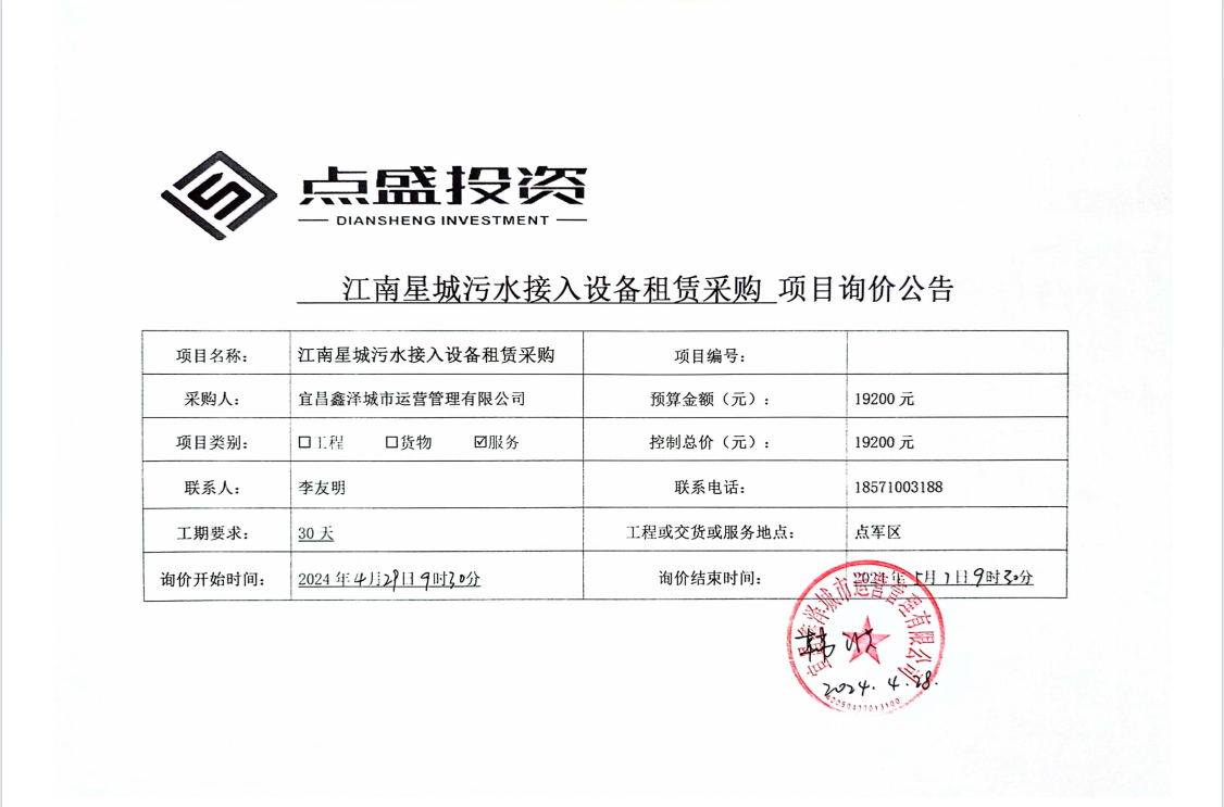 江南星城污水接入設(shè)備租賃采購(gòu)詢(xún)價(jià)公告