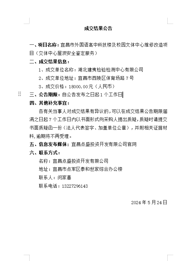 宜昌市外國(guó)語(yǔ)高中科技樓及校園文體中心維修改造項(xiàng)目(交體中心屋頂安全鑒定服務(wù))成交公告