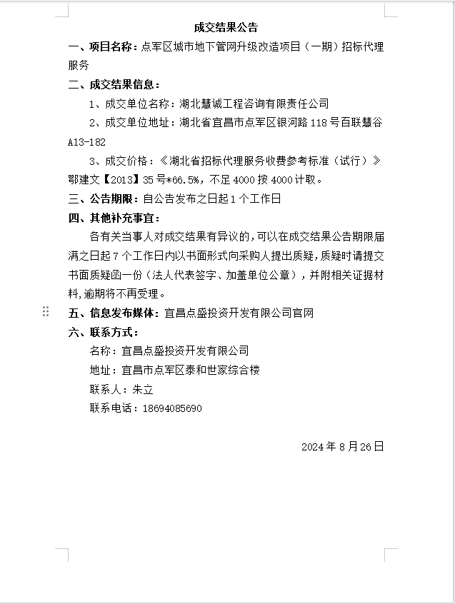 點(diǎn)軍區(qū)城市地下管網(wǎng)升級(jí)改造項(xiàng)目(一期)招標(biāo)代理服務(wù)成交公告