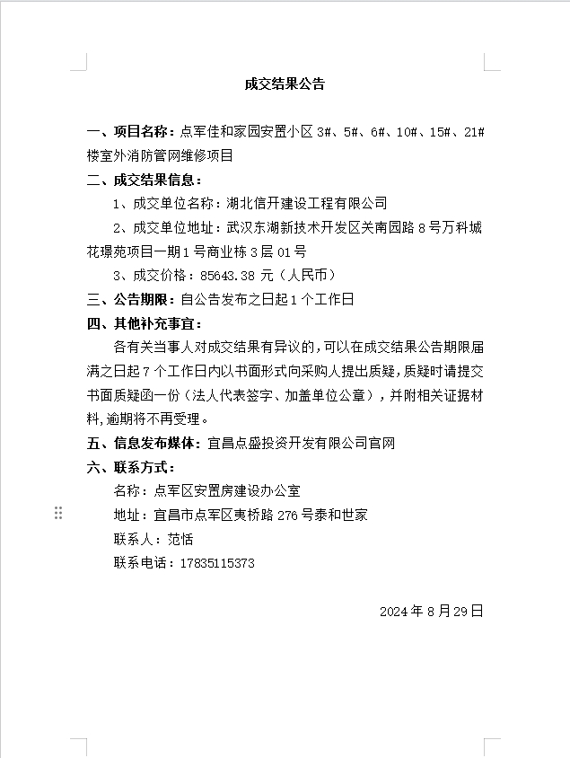 點(diǎn)軍佳和家園安置小區(qū)3#、5#、6#、10#、15#、21#樓室外消防管網(wǎng)維修項目成交公告