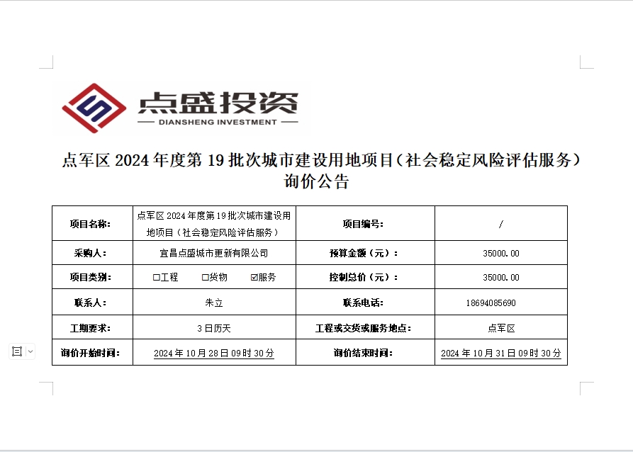 點(diǎn)軍區(qū)2024年度第19批次城市建設(shè)用地項(xiàng)目(社會(huì)穩(wěn)定風(fēng)險(xiǎn)評(píng)估服務(wù))詢價(jià)公告