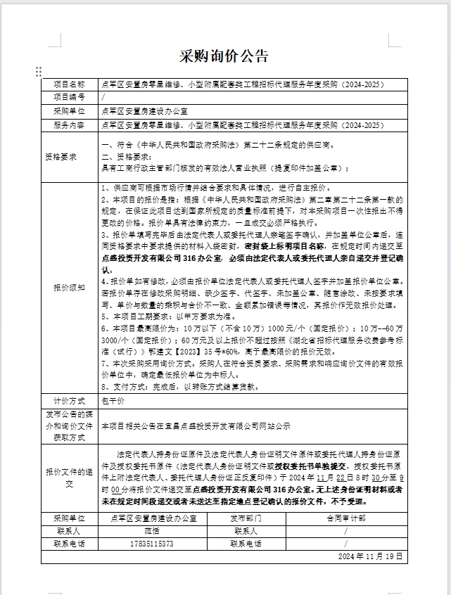點(diǎn)軍區(qū)安置房零星維修、小型附屬配套類工程招標(biāo)代理服務(wù)年度采購(2024-2025)詢價(jià)公告