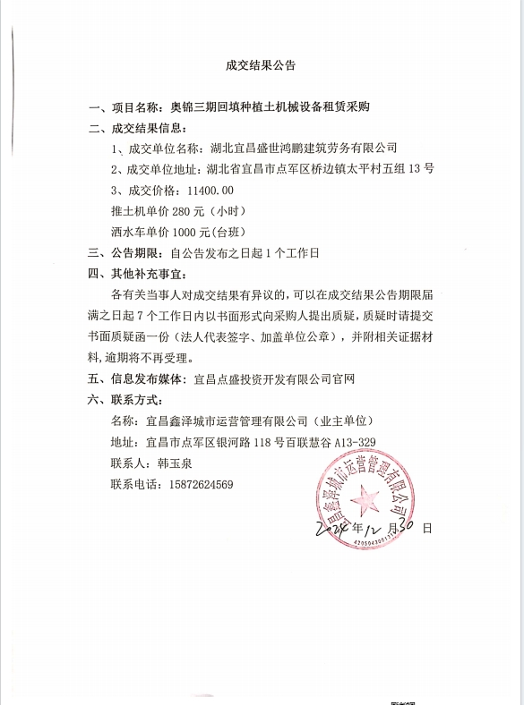 奧錦三期種植土回填機械設備租賃采購成交公告
